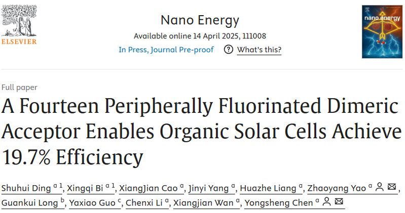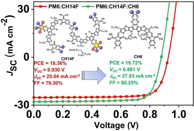 低聚小分子受体(OSMAs)可以结合小分子受体 (SMAs)和聚合受体(PSMAs)的优点,包括明确的分子结构、高玻璃化转变温度和低扩散速率。然而,分子对称性和平面性的降低通常会降低分子间堆叠强度和有序性,从而降低有机太阳能电池的功率转换效率。在此,在 OSMAs 的二维平面的外围进行了最大的氟化,产生了 CH14F 的14个含氟二聚体受体,在目前所有 OSMAs 中提供了最富氟的分子骨架。骨架的充分外周氟化导致分子堆积更紧凑有序,从而提高了 OSCs 的填充因子。结果,PM6:CH14F:CH6 三元器件实现了 19.72% 的一流 PCE。更重要的是,PM6:CH14F 装置在 65 ℃下连续加热 1032 小时后,仍保留了超过 80% 的初始 PCE。此项工作表明,在 OSMAs 上实施足够的外周氟化可以通过显着增强的氟诱导的次级相互作用来克服分子堆积紊乱,从而同时为具有出色效率和稳定性的 OSCs 提供新的见解。