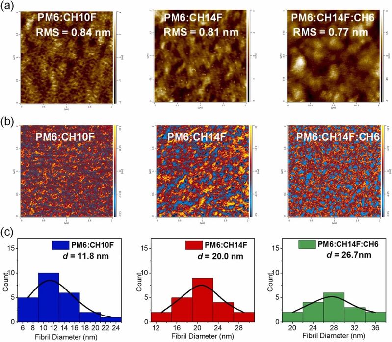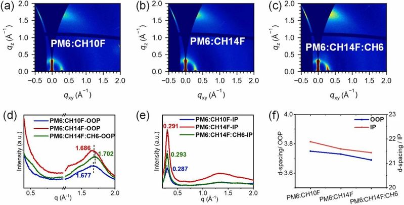 图 5. (a-c)优化的 OSC 混合薄膜的二维 GIWAXS 图样。(d, e) PM6:CH10F、PM6:CH14F 和 PM6:CH14F:CH6 混合薄膜的线切割剖面。(f)混合薄膜在 OOP 方向上的 (010) d 间距和在 IP 方向上的 (100) d 间距。