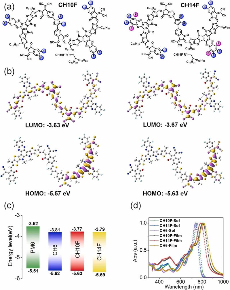 图 1. (a) CH10F 和 CH14F 的化学结构。(b) 分子前沿轨道的空间分布。为便于比较,列出了 HOMO 和 LUMO 能级值。(c) 通过 CV 测量得出的能级。(d) UV-vis光谱。