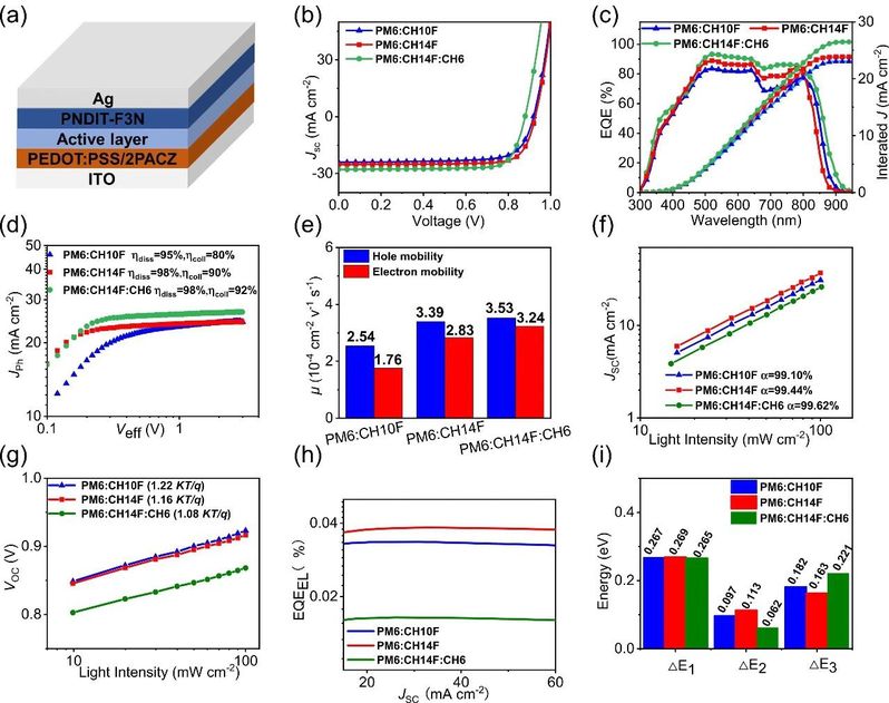 图 3. (a) 器件结构示意图。(b) OSCs 的 J-V 曲线。(d) 显示 ηdiss 和 ηcoll 的 Jph 与 Veff 曲线。(e) OSCs 的空穴和电子迁移率。(f) JSC 的光强(Plight)依赖性。(g) 光强(Plight)与 VOC 的关系。(h) 电致发光 EQE 的光谱。(i) OSCs 的 Eloss 和详细的 ΔE1、ΔE2 和 ΔE3 三部分值。