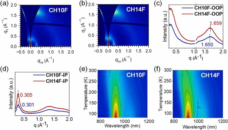图 2. (a, b) 纯薄膜的二维 GIWAXS 图样。(c, d) CH10F 和 CH14F 纯薄膜的线切割剖面图。(e, f) 纯薄膜随温度变化的 PL 光谱。