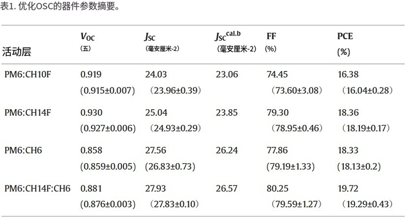 基于PM6:CH10F和PM6:CH14F NFAs的传统器件采用 ITO/PEDOT:PSS/PM6:NFAs/PNDIT-F3N/Ag 结构制造。具体来说,在超声波浴中依次用洗涤剂水、去离子水、丙酮和异丙醇清洗 ITO 涂层玻璃基底 15 分钟,然后用氮气吹干。使用前,在紫外线-臭氧室(Jelight 公司)中对清洗过的 ITO 基底进行 15 分钟的紫外线照射处理。然后,在 ITO 基底上以 4300 rpm 的转速旋涂一薄层PEDOT:PSS,时间为 20 秒。随后,将 PEDOT:PSS 薄膜在 160 ℃ 的环境条件下烘烤 15 分钟,并迅速转移到手套箱中。然后将二元 PM6:CH14F 混合物(D:A 比=1:1.2)完全溶解在供体浓度为 6 mg mL-1 的氯仿(CF)中,并在室温下搅拌 6 小时,然后以 2200 rpm 的转速在 PEDOT:PSS 层上旋涂 30 秒。旋涂后,混合薄膜在 90 ℃ 下退火 5 分钟。最后,在 2×10-6 Pa 下沉积 150 nm 的银。我们实验室的掩膜面积约为 3.24 mm2。测试期间的器件照明面积为 7×7 cm2。装置和掩膜的面积是用光学轮廓仪 (PSM-1000) 确定的。基于 PM6:CH10F 的二元器件采用上述程序制备。对于基于 PM6:CH14F:CH6 的器件,PM6:CH14F:CH6 溶液(按重量计为 1:0.1:1.1)在室温下搅拌 6 小时,然后以 2100 rpm 的转速在 2PACZ (0.3 mg/ml)层上旋转浇铸 30 秒。三元装置采用上述程序制备。