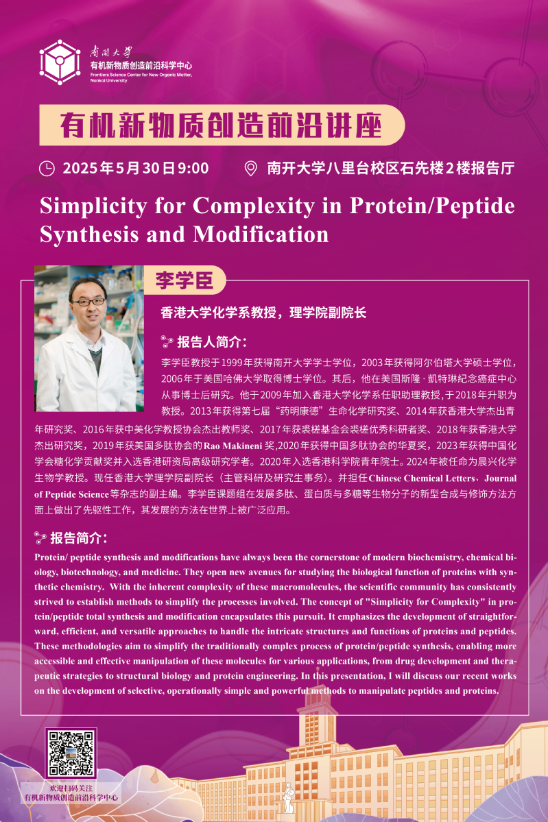 有机新物质创造前沿讲座:Simplicity for Complexity in Protein/Peptide Synthesis and Modification