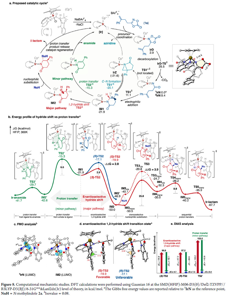 最后,作者以二噁唑酮1a为底物、N-甲基吲哚2a为亲核试剂、Cp*IrL1Cl为催化剂,进行了密度泛函理论(DFT)计算(图8)。提出的催化循环(图8a)始于从催化剂中攫取Cl阴离子,形成活性催化物种阳离子铱配合物[Ir]。该物种与1a配位生成中间体IrD,IrD经过过渡态IrD-TS‡ (ΔG‡ = 22.6 kcal/mol)脱去一分子CO2,生成Ir-酰基氮宾IrN复合物。然后与烯烃发生分子内亲电加成,通过TS1‡(ΔG‡ = 11.1 kcal/mol)形成苄基碳正离子中间体IM1(ΔG = −21.9 kcal/mol)。随后,在特制的手性疏水微环境中,底物采取有利的构象,使C-H键与苄基碳正离子的空p轨道对齐,从而促进高度对映选择性、协同的1,2-负氢迁移产生氮杂碳正离子IM2。S构型((S)-TS2‡, ΔG‡ = −19.9 kcal/mol)的过渡态能量比相应的R构型((R)-TS2‡, ΔG‡ = −17.1 kcal/mol)低2.8 kcal/mol,与实验观察到的>99% ee值一致。对(S)-TS2‡的非共价相互作用 (NCI) 分析突出了催化剂NPhth基团与氢化物之间的关键C−H···π相互作用 (图 8d 和 1d (右),这显著促进了1,2-负氢迁移。随后,IM2与N-甲基吲哚2a发生立体选择性亲核取代反应,经历过渡态TS3trans‡(ΔG‡ = −24.7 kcal/mol),得到中间体IM4trans(ΔG = −35.0 kcal/mol)。最后,AQ配体和内酰胺中间体之间发生两次连续的质子转移,最终得到反式内酰胺产物(ΔG‡ = −67.7 kcal/mol),并再生出Ir催化剂,从而完成了对映选择性1,2-负氢迁移催化循环。