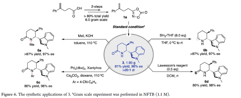 为了证明该方法的实用性,作者首先进行了克级实验,得到1.93 g化合物3(图6)。通过一系列转化,证明了化合物3的多功能性。在KOH/MeI条件下,化合物3发生甲基化,得到产物6a,产率接近定量,且ee值没有损失。此外,使用BH3·THF还原化合物3几乎以定量的收率和97% ee得到产物6b。化合物3在Pd2(dba)3催化的Buchwald-Hartwig偶联反应中,以86%的收率和98%的ee值生成6c。最后,在0.5当量Lawesson试剂存在下,化合物3的羰基被转化为硫代羰基,得到产物6d,收率80%,ee值98%。这些转化突显了δ-内酰胺产物的稳定性和合成实用性。