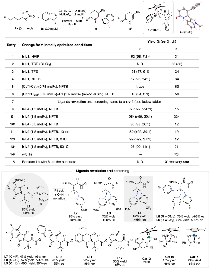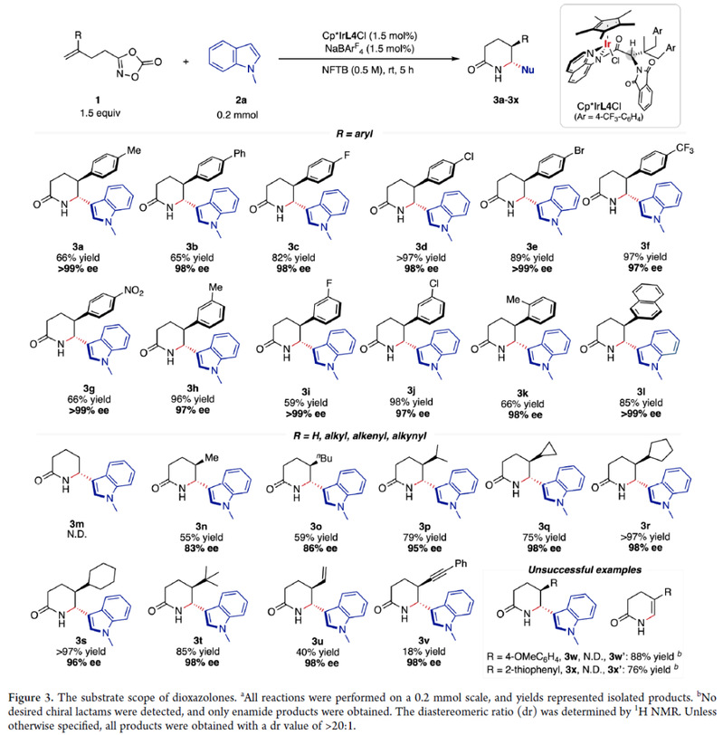 首先,作者以含末端烯烃的1,4,2-二噁唑-5-酮1a为模型底物,N-甲基吲哚2a为亲核试剂,使用含有L1 配体的Cp*IrL1Cl为催化剂,NaBArF4为添加剂,六氟异丙醇(HFIP)为溶剂进行初步尝试,发现可以得到手性δ-内酰胺3 ( 52% 收率,98% ee,7:1 dr),同时伴随着烯烃的C-H插入产物3′和HFIP的溶剂解副产物5e (entry 1)。后续作者进行了一系列溶剂、催化剂、反应温度等条件的考察,确定了最优反应条件:1a (1.5 equiv),2a (0.2 mmol), Cp*IrL4Cl (1.5 mol%),NaBArF4 (1.5 mol%),HFIP (0.5 M),25 oC,air,5 h。