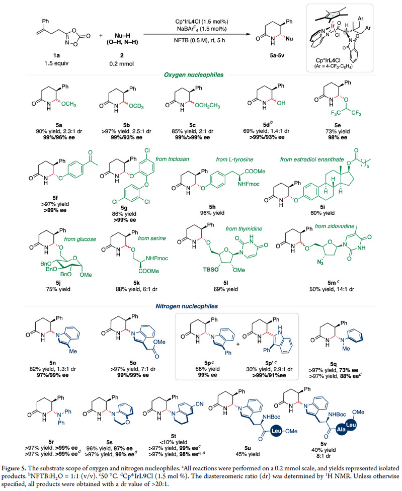 随后,作者考察了氧亲核试剂(图5)。在标准条件下,使用甲醇、氘代甲醇、乙醇、水及HFIP,均可得到目标产物5a-5e,产率中等,且具有优异的对映选择性(93%-99% ee)。值得注意的是,酚类衍生物作为亲核试剂,生成O-进攻的产物5f-5i,产率中等至优异,且均具有> 99% ee和> 20:1 dr。此外,该反应兼容含醇羟基的底物,以优异的非对映选择性得到内酰胺5j-5m。最后,作者对氮亲核试剂进行了考察。3-取代吲哚,二级芳胺类亲核试剂均可以以良好到优异的收率得到5n-5t, 且具有优异的对映选择性。令人鼓舞的是,基于色氨酸的二肽5u和三肽5v分别以45%和40%的产率得到目标产物,且具有良好至优异的非对映选择性。这种催化方法为多肽化学中色氨酸残基的选择性修饰提供了一种有前景的方法,凸显了其在生物共轭和药物化学中的潜在应用。