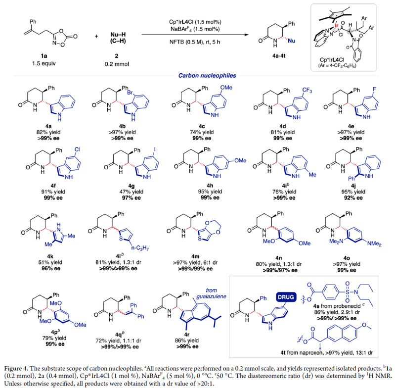接下来,作者对各类亲核试剂进行了考察。首先研究了碳亲核试剂。如图4所示,各种吲哚衍生物、富电子(杂)芳环化合物、富电子芳烃以及富电子烯烃以中等至良好的收率得到内酰胺4a-4r,并具有优异的非对映选择性(>20:1 dr)和对映选择性(92%-99% ee)。值得注意的是,药物分子丙磺舒和萘普生衍生的5-取代吲哚底物也具有良好的耐受性,以中等至优异的收率和非对映选择性得到目标产物4s和4t。