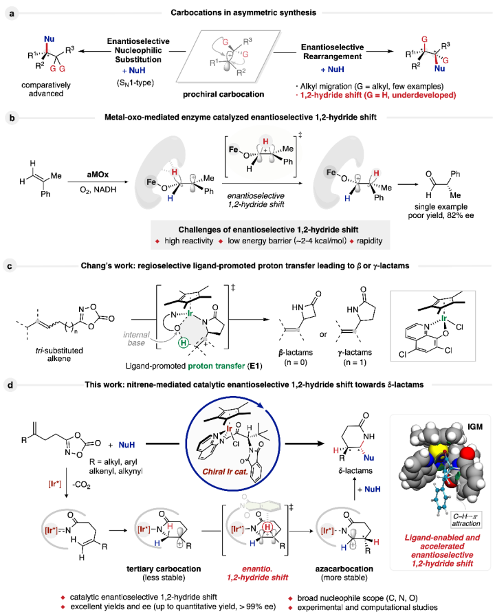自从 Norris、Kehrmann和Wentzel 开创性地发现三苯甲基碳正离子以来,碳正离子化学取得了显著进展。碳正离子现已广泛应用于药物合成、农用化学品开发、材料科学和天然产物合成,彰显了其在现代有机化学中的关键作用。然而,不对称催化碳正离子转化的研究相对滞后,大多数研究集中在对映选择性单分子亲核取代 (SN1) 反应(图1a)上。碳正离子重排为构建复杂的分子骨架提供了一种通用且高效的策略。尽管这些反应具有实用性,但实现对这些反应的选择性控制,比如化学选择性、区域选择性,尤其是对映选择性,仍然是催化体系中的一个基本挑战。这一挑战源于碳正离子中间体固有的高能量状态和快速反应动力学性质,这使得实现高对映选择性极其困难。迄今为止,催化不对称碳正离子重排主要集中在烷基或芳基的迁移上,通常由环张力的释放驱动。然而,由1,2-负氢迁移驱动的碳正离子重排,比烷基迁移更快,由于其快速性而面临重大挑战。1,2-负氢迁移反应速度极快,活化能极低(约2-4 kcal/mol),部分受超共轭作用促进,使其反应速度显著快于SN1或E1反应。这种快速的反应性,以及较低的活化能垒,使得控制1,2-负氢迁移的立体选择性尤为困难。因此,关于高效催化对映选择性1,2-负氢迁移的报道极为稀少。目前唯一报道的例子是Arnold课题组报道的酶催化α-甲基苯乙烯对映选择性anti-Markovnikov氧化反应,这突显了此类转化的稀有性和难度(图1b)。