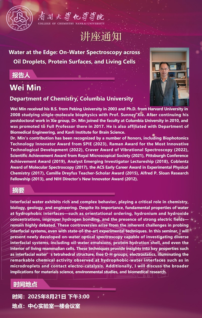 学术报告:Water at the Edge: On-Water Spectroscopy across Oil Droplets, Protein Surfaces, and Living Cells