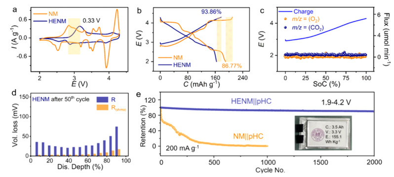 电化学测试显示,基于Ni²⁺/Ni³⁺和Fe³⁺/Fe⁴⁺的氧化还原反应,HENM在2.0-4.3 V的电压范围内实现了160.2 mAh/g的比容量。组装的软包电池在4.2 V高电压下达到了155.1 Wh/kg的能量密度,并在2000次循环后仍保留了88%的初始容量。GITT测试表明,HENM的钠离子扩散系数较对照材料高出一个数量级,进一步验证了其快速的动力学特性。此外,HENM的平均放电过电势在50次循环后仅为0.025 ± 0.005 V,远低于NM的0.106 ± 0.012 V。这些结果表明,熵调控不仅提高了材料的离子传输速率,还显著降低了界面阻抗,从而增强了电池的倍率性能和循环寿命。