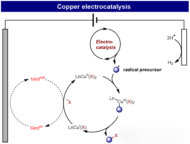 在这些过渡金属催化剂中,廉价且丰度高的铜金属催化的电化学转化受到了相当大的关注,例如对映选择性C−H氰基化反应、脱羧氰基化反应、烯烃的双官能团化反应。铜可以以Cu0、CuI、CuII和CuIII氧化态存在,从而实现单电子或双电子转化途径。此外,铜的不同氧化态可以与路易斯酸相互作用,或与不同的官能团进行π配位。3d过渡金属铜的独特活性使其成为早期建立的4d和5d过渡金属(如钯、铑和铱)的替代品。本综述就近些年的电化学铜催化的最新进展进行了总结介绍,重点关注了电铜催化对烯烃的双官能团化、C−H键官能团化、C−C键活化、C−X键活化。此外,还提出了有机电化学铜催化在选择性控制和反应类型的潜在挑战和未来展望。