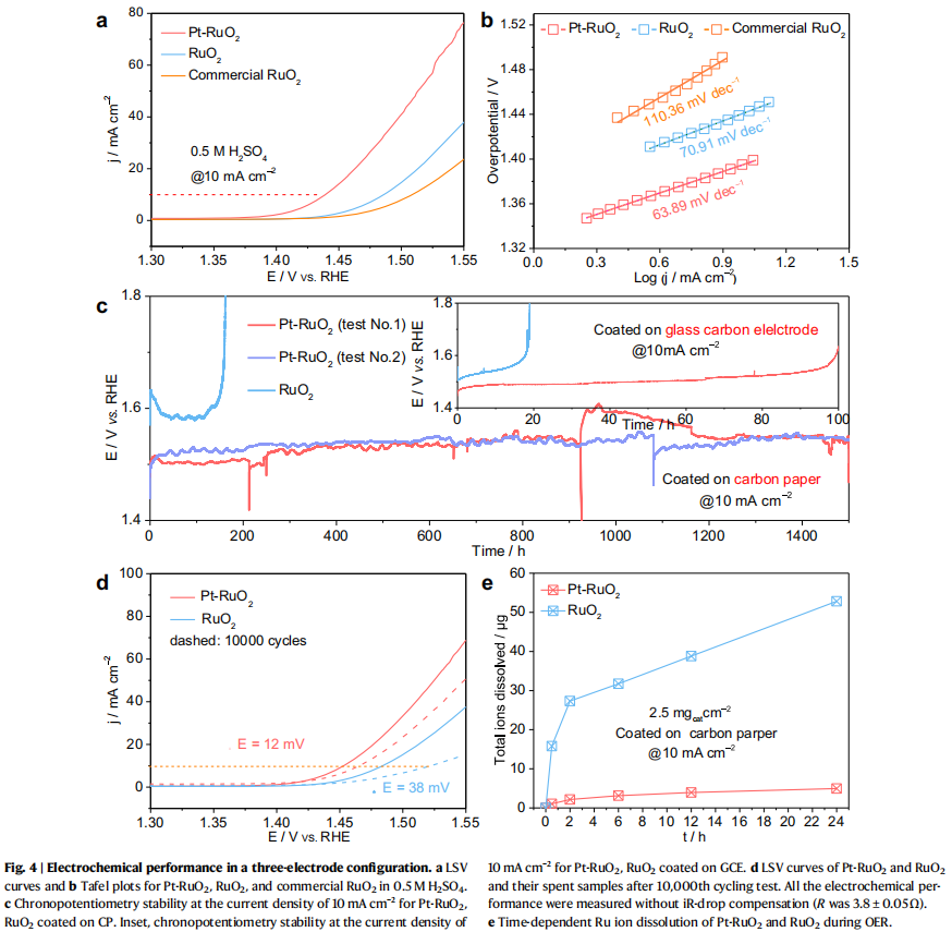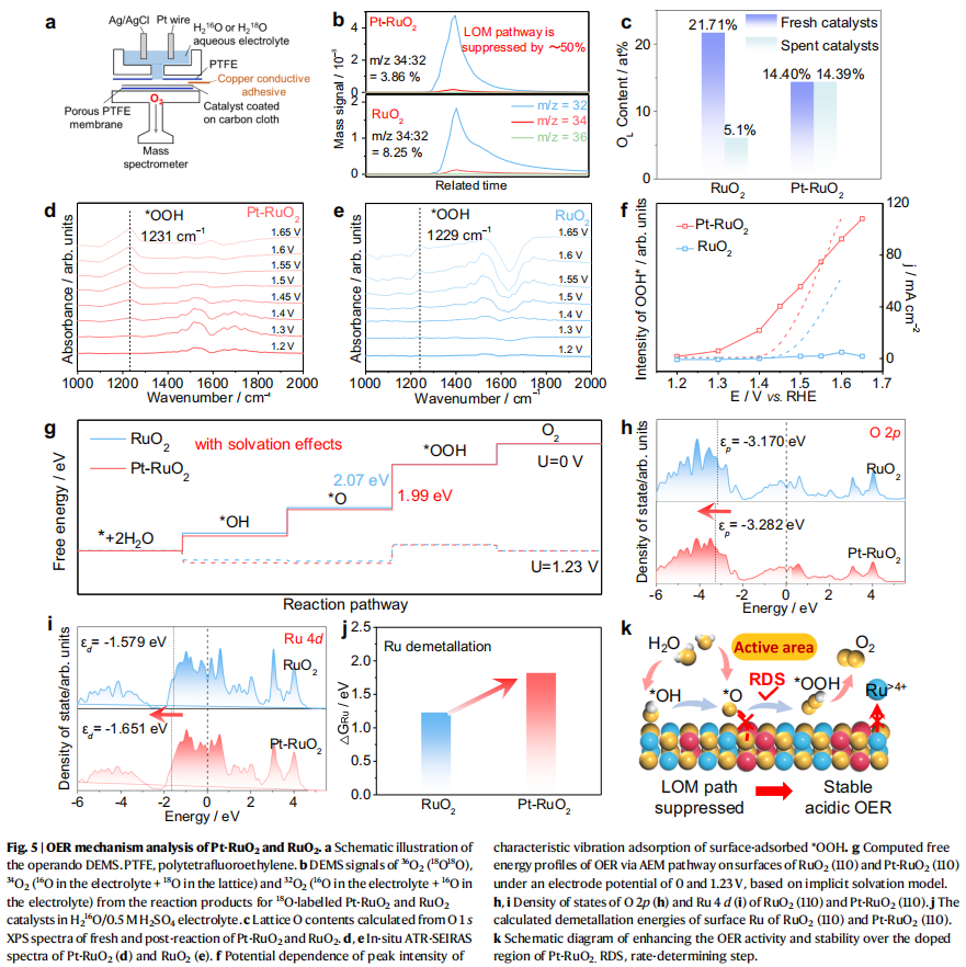 同位素示踪(DEMS):证实Pt-RuO₂中晶格氧参与路径(LOM)减少50%