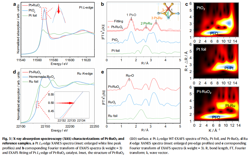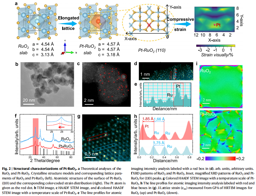 局部压缩应变:Pt原子挤压周围Ru原子,导致局域压缩,削弱氧中间体吸附能,加速反应动力学(活性↑)