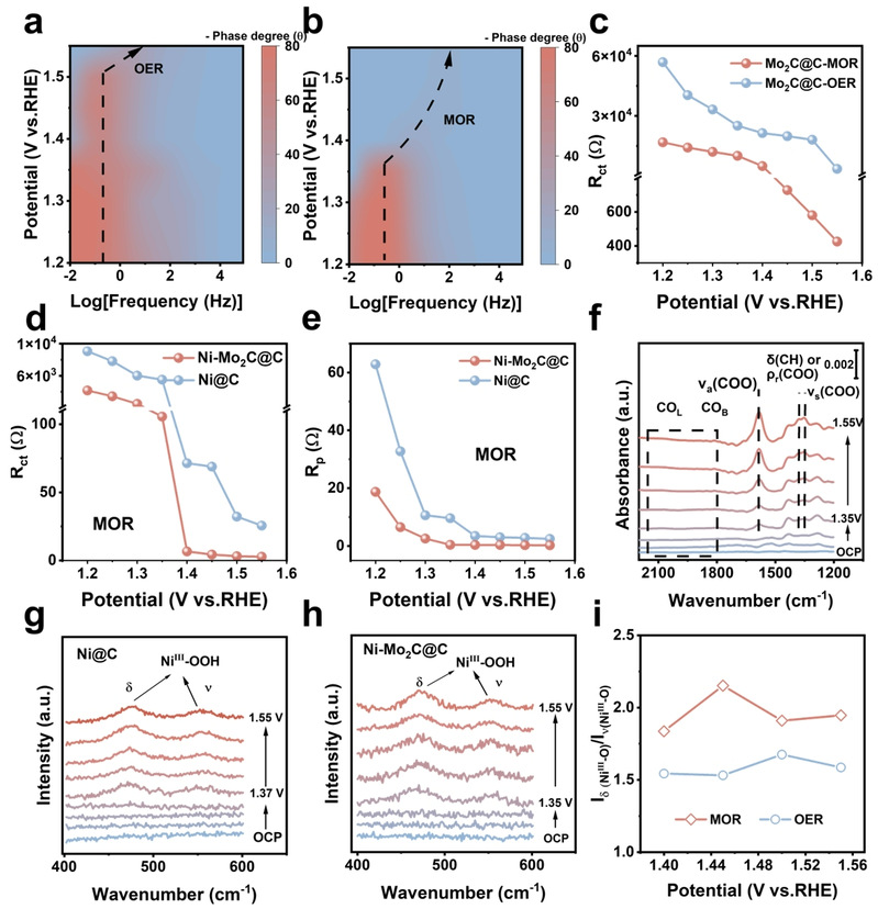 原位阻抗谱以及原位红外,原位拉曼结果表明催化剂在电化学过程中会原位重构形成真实活性相NiOOH-Mo2C参与催化反应,并且Mo2C的引入可以促进Ni位点的重构。值得注意的是,单独的NiOOH MOR活性较弱,而单独的Mo2C基本不发生MOR。