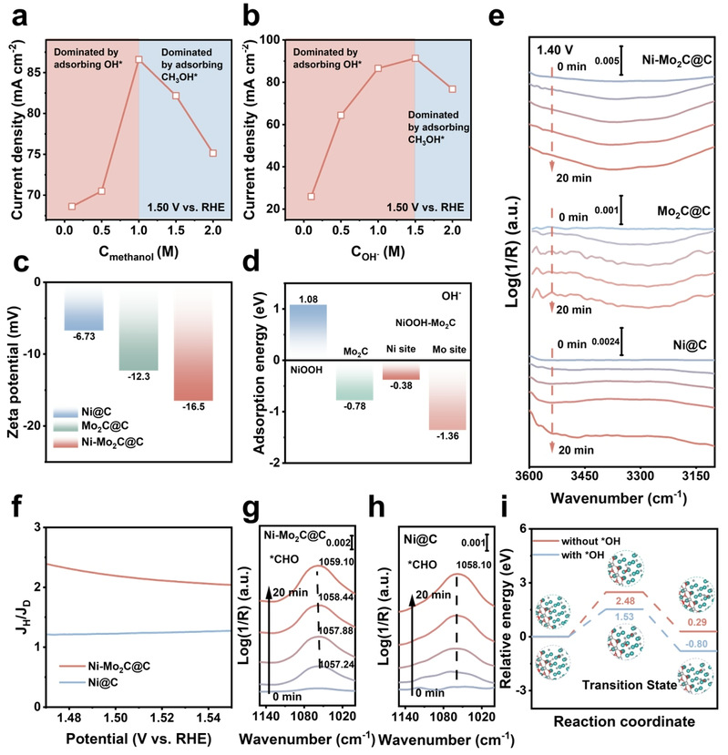 镍基催化剂因成本低、甲醇吸附能力强且对C-H键活化性能优异而备受关注,但其氢氧根吸附能力不足,成为性能瓶颈。碳化钼(Mo2C)具有可调的OH⁻吸附能,有利于*CHO中间体的偶联,同时其低析氧活性可减少副反应,是理想的助催化组分。基于此,我们通过电化学原位构建 NiOOH–Mo2C 异质结,实现界面甲醇与OH⁻的协同调控,从而优化反应路径,显著提升 MOR 性能。