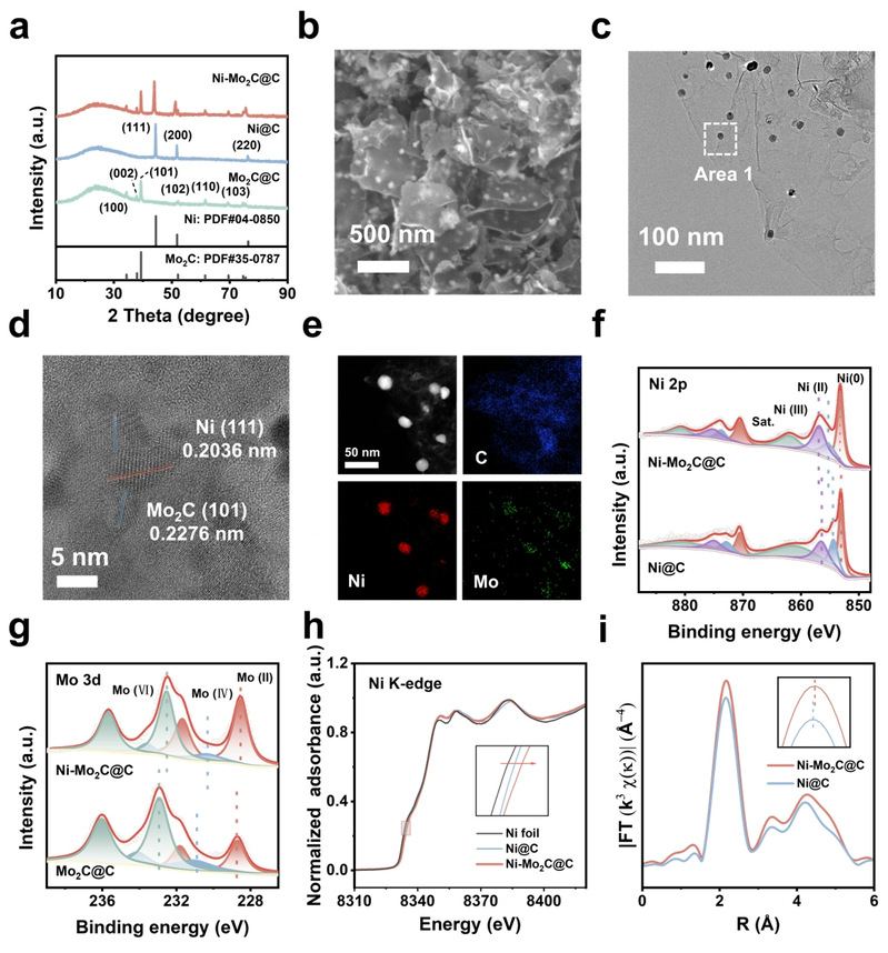 该研究首先合成Ni-Mo2C@C作为预催化剂。形貌分析显示,Ni-Mo2C异质结以颗粒形式(~10 nm)均匀负载在三维碳骨架上。XRD与HRTEM结果证实异质结构的形成。XPS与Ni K-edge XANES/EXAFS测试进一步揭示,Mo2C的引入有利于Ni 位点的平均价态升高,同时Ni–O键强度减弱,从而有利于催化剂表面重构。