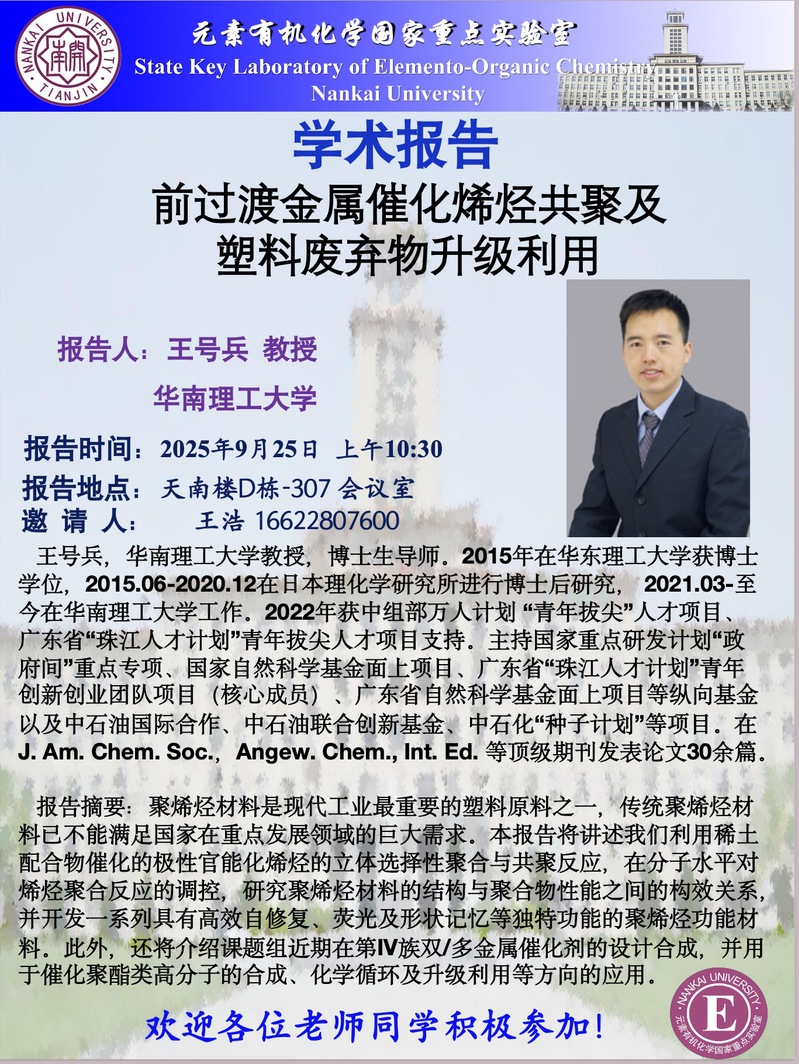 学术报告:前过渡金属催化烯烃共聚及塑料废弃物升级利用