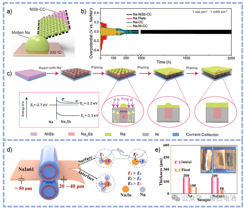 图4:降低钠金属箔负极厚度的策略。a) 通过熔融灌注法在NiSb-CC上制备高面容量钠金属负极的示意图;b) 基于不同宿主材料的钠金属负极对称电池在1 mAh cm-2电流密度下的耐久性对比;c) 通过自调节机制实现平滑钠沉积的示意图。 d) 增强NaIn61复合箔机械加工性能的强化机制示意图;e) 纯钠箔与NaIn61复合箔的粘度测试及对应实物照片。
