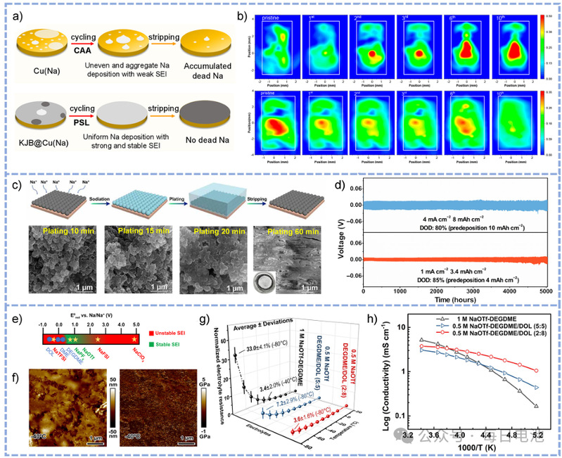 图5:预沉积钠金属负极的策略。a) 裸铜集流体与KJB@Cu集流体上钠沉积机理示意图;b) 对应的原位空间分辨EPRI结果。c) At-Sn@HCN材料结构示意图及其沉积形貌;d) 不同放电深度下的性能表现。e) 盐类(星形)与溶剂(圆点)还原电势的计算结果示意图;f) 0.5 M NaOTf-DEGDME/DOL (2:8) 电解质在-40°C下的形貌特征与杨氏模量;g) 电解质溶液电阻变化;h) 在+20°C至-80°C温度区间内对应的离子电导率。