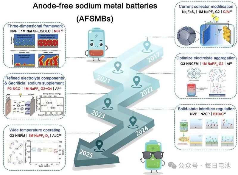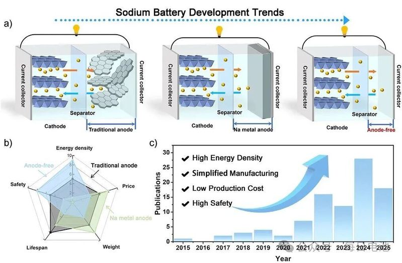 本综述系统阐述了从传统钠基电池到无负极构型的演进路径,包括采用有限金属含量负极的过渡性策略,进而重点聚焦于提升电池性能与耐久性的最新研究进展。