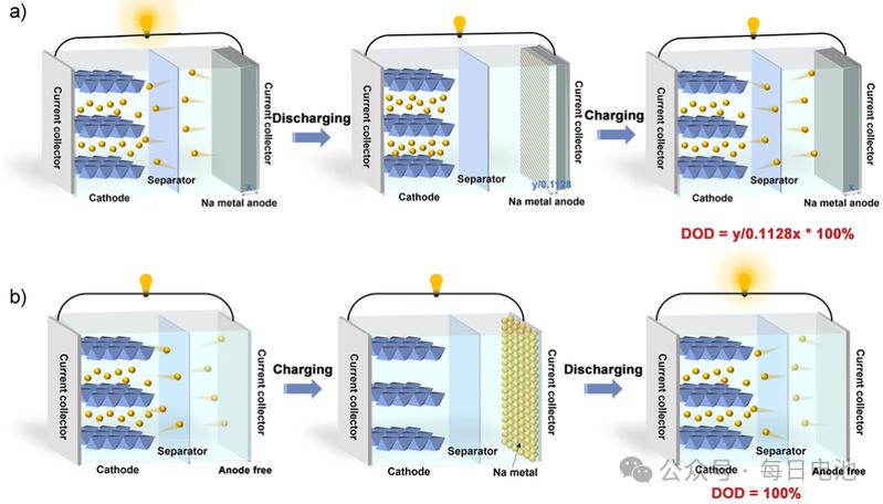 图3:放电深度计算示意图。a) 传统钠金属电池充放电过程示意图及对应的放电深度计算公式;b) 实现100%放电深度的无负极钠金属电池示意图。