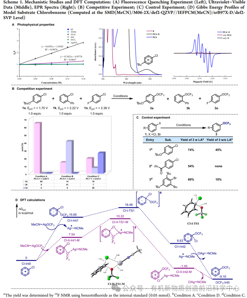 光开关实验与量子效率测定排除链式自由基路径;荧光淬灭、UV-vis及EPR证实PC*与芳卤发生SET生成芳基阳离子自由基;竞争实验显示只有氧化电位匹配的光敏剂才能转化对应底物;Lewis酸(ZnCl₂、AlCl₃、CoF₃)对惰性底物促进更显著,DFT计算表明Ag⁺同时与Cl⁻及OCF₃成桥,过渡态能垒由16.5降至14.8 kcal mol⁻¹,加速卤素离去并抑制产物回电子转移,从而抑制副反应。