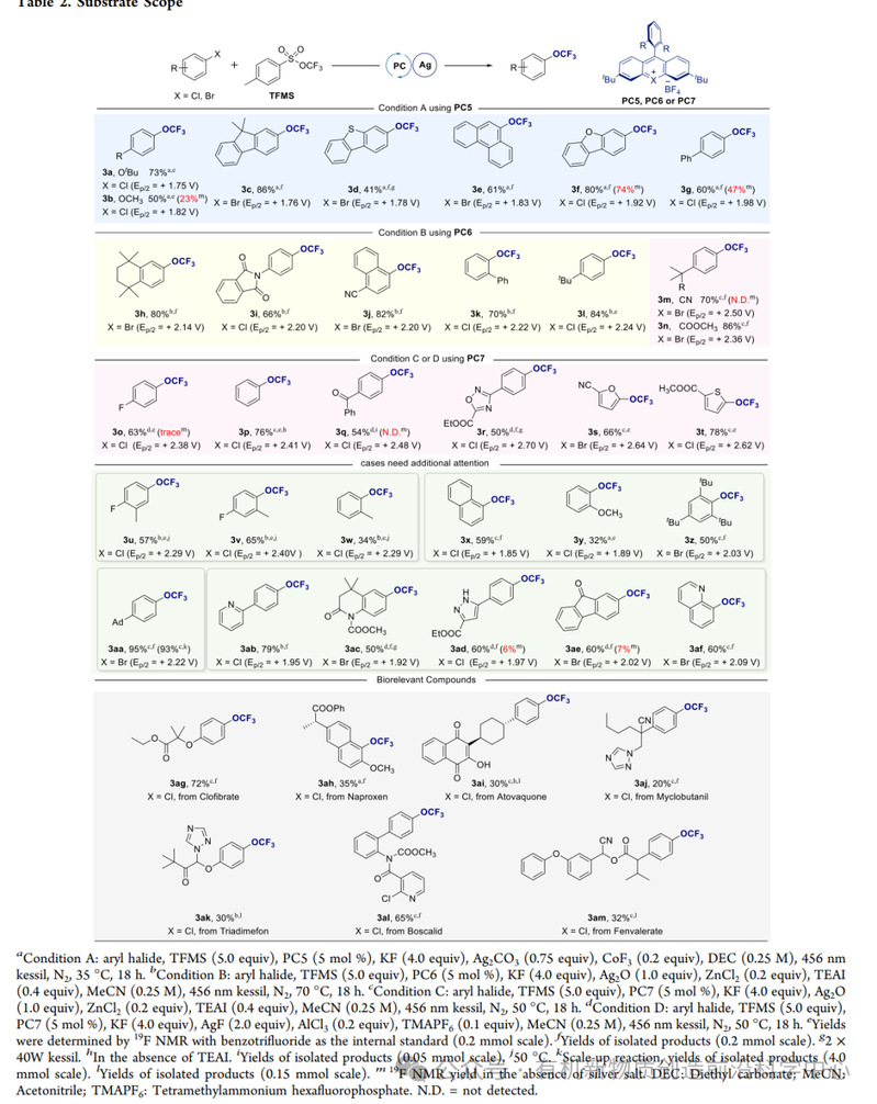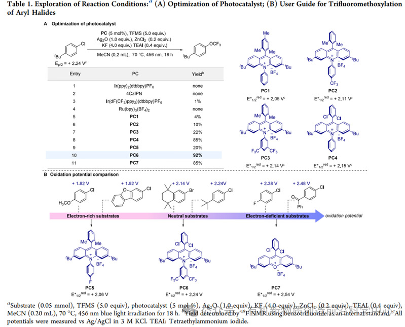 作者以4-叔丁基氯苯1l为模型,TFMS(5 eq)为OCF₃源,系统筛选光敏剂、银盐、碱及添加剂。最优条件为:Acridinium PC6(5 mol%)、Ag₂O(1 eq)、KF(4 eq)、ZnCl₂(0.2 eq)、TEAI(0.4 eq),MeCN 0.25 M,456 nm蓝光、70 °C、18 h,¹⁹F NMR收率92%。TEAI兼具增溶与稳定OCF₃作用;PC6激发态还原电位(+2.24 V)与底物氧化电位匹配最佳;无银时反应完全停止,凸显银对惰性卤化物不可或缺。