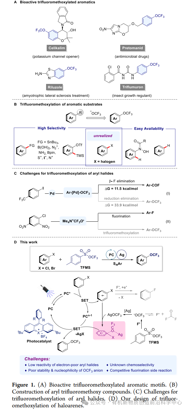 三氟甲氧基(OCF₃)因其独特的立体正交性、高电负性和优异亲脂性,广泛存在于Pretomanid、Triflumuron等药物及农药中。然而OCF₃阴离子热稳定性差、亲核性弱,直接对芳基卤化物进行三氟甲氧基化一直是合成难题。传统策略需预置Sn、B、N₂⁺等官能团,或虽使用C-H底物但位点选择性受限。使用廉价易得的芳基卤作为底物的直接三氟甲氧基化反应存在诸多挑战,即便过渡金属催化也难以实现,例如钯催化路线通常受β-F消除与竞争氟化困扰。因此,开发条件温和、选择性高、对电子中性及缺电芳基卤兼容的通用方法,对药物后期修饰和功能材料构建具有重要意义。