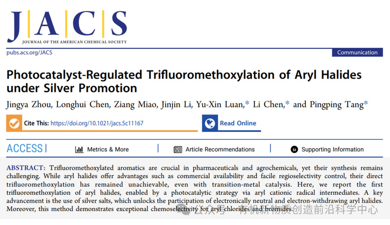 Jingya Zhou, Longhui Chen, Ziang Miao, Jinjin Li, Yu-Xin Luan,* Li Chen,* Pingping Tang*, Photocatalyst-Regulated Trifluoromethoxylation of Aryl Halides under Silver Promotion, Journal of the American Chemical Society, 2025