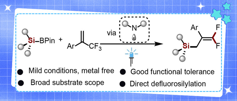 硅衍生物在作为关键原料在相关领域内至关重要,但硅硼酸频哪醇酯的高氧化电位限制了其光催化硅烷化应用。传统方法依赖亲核试剂降低电位,而胺自由基作为一种创新策略,展现出活化Si–B键的潜力,为绿色合成提供新途径。但目前含硅和偕二氟烯基片段在多数化合物中独立存在,而两者独特的构型及其在药物化学中的应用前景,将其引入同一分子将为药物化学家提供全新的研究视角。