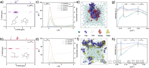 图2. 稀释剂在LUCEs中的切片与稳定作用。a) L₁.₅MT₁₅电解质和b) L₁.₅TT₁₅电解质的¹H−⁷Li HOESY谱图。通过分子动力学模拟获得的c) L₁.₅MT₁₅电解质和d) L₁.₅TT₁₅电解质的径向分布函数与配位数。e) L₁.₅MT₁₅电解质和f) L₁.₅TT₁₅电解质的MD模拟快照,展示了代表性溶剂化结构。基于MODL的g)和基于TMM的h)电解质的SAXS图谱,其中对比测试了HCEs(L₁M₁, L₁T₁)、LHCEs(L₁MT₁₀, L₁TT₁₀)和LUCEs(L₁.₅MT₁₅, L₁.₅TT₁₅)。