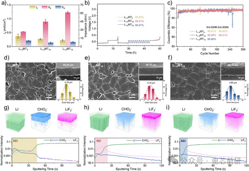 图4. MODL基LUCEs对锂负极的界面动力学与稳定性研究。a) 通过对称Li||Li电池的Tafel曲线和电化学阻抗谱获得的交换电流密度、体相阻抗和电荷转移阻抗。误差棒来源于三次平行实验。b) 通过Aurbach方法测试的锂沉积/剥离库仑效率,以及c) Li||Cu半电池的长循环性能。d) L₁.₅MT₅、e) L₁.₅MT₁₀和f) L₁.₅MT₁₅电解液中铜箔上锂沉积的俯视图(左)、截面图(右上)及相应的晶粒尺寸分布(右下)。g) L₁.₅MT₅、h) L₁.₅MT₁₀和i) L₁.₅MT₁₅电解液中沉积锂表面形成SEI的TOF-SIMS三维视图(上)及代表性二次离子碎片的深度分布图(下)。
