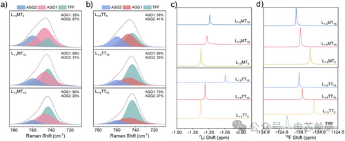 图3. 不同稀释剂比例下LUCEs的光谱表征。a) 基于MODL和b) 基于TMM的LUCEs在S-N-S弯曲振动峰(~710–785 cm⁻¹)区域的拉曼光谱,以及相应的分峰拟合曲线与各溶剂化结构占比。c) 基于MODL(上图)和基于TMM(下图)LUCEs的⁷Li NMR谱图,以及d) 其¹⁹F NMR谱图。