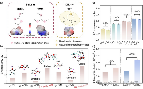 图1. LUCEs的设计原理与离子传输优势。a) 选择具有多配位位点的MODL和TMM作为溶剂,选择具有低空间位阻的TFF作为稀释剂。分子下方列出了相应的静电势分布图。白色、青色和红色球体分别代表H、C和O原子。b) 不同溶剂化结构的结合能,表明TFF稀释剂能够稳定LUCEs中的2Li+-溶剂结构。c) 各类电解质的锂离子迁移数对比。误差棒来源于两次平行实验。d) LHCEs与LUCEs的锂离子扩散系数对比。