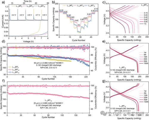 图5. 采用MODL基LUCEs的高压Li||NCM811锂金属电池的电化学性能。a) 通过Li||NCM811全电池的恒压极化测试(上图)和Li||Al半电池的线性扫描伏安测试(下图)获得的电解液氧化稳定性。b) 采用三种MODL基LUCEs的LMBs倍率性能,及c) 使用L₁.₅MT₁₀电解液对应的恒电流充放电曲线。d) 采用三种MODL基LUCEs的循环性能与库仑效率,及e) 使用L₁.₅MT₁₀电解液对应的恒电流充放电曲线。(b-e)中的电压范围为2.8-4.3 V。f) 在更高充电电压(2.8-4.4 V)下使用L₁.₅MT₁₀电解液的循环性能与库仑效率,及g) 对应的恒电流充放电曲线。(a-e)和(f-g)中的LMBs分别使用50μm和20μm厚锂箔。(b-g)中所有电池均采用面容量为3.885 mAh cm⁻²的正极,并首先以0.13 C进行两次化成循环。