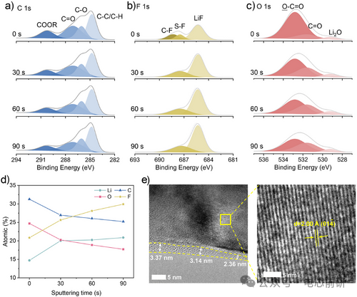 图6. NCM811正极表面形成的CEI组成与形貌分析。(a-d) XPS分析:不同溅射时间下的C 1s a)、F 1s b)、O 1s c)谱图及相应的原子比例分析d)。e) 循环后NCM811正极的TEM图像,其中CEI层厚度用黄色虚线标出(左图),正极内部晶格结构表征见右图。所有正极样品均在完全放电状态下进行表征,取自使用L₁.₅MT₁₀电解液的Li||NCM811全电池在0.13 C倍率下循环5次后的电池。