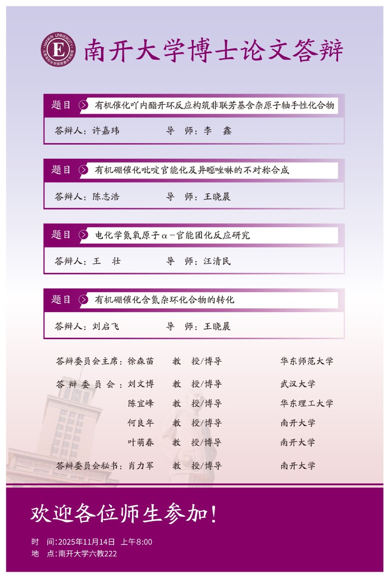 Betway必威学术学位博士研究生学位论文答辩 许嘉玮,陈志浩,王壮,刘启飞