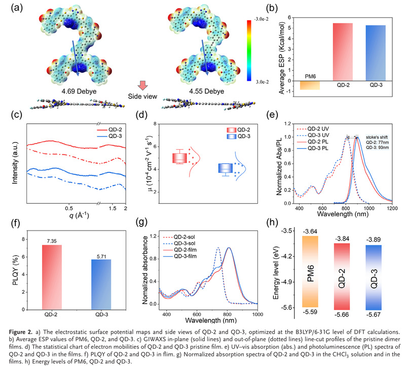 1.纯薄膜的掠入射广角X射线散射(GIWAXs)用于揭示分子有序堆积。值得注意的是,QD-3表现出比QD-2更紧密的π-π堆叠和更长的晶体相干长度(CCL),这可能是由于乙炔的更刚性的线性结构,这消除了旋转自由度,从而形成了更平面的骨架结构。