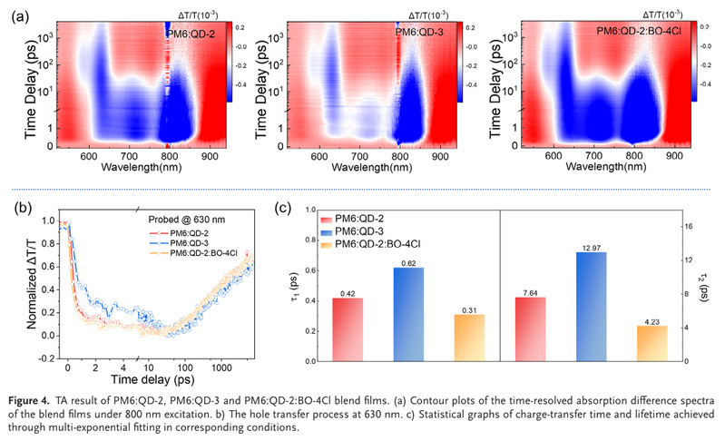 3.在所研究的体系中,三元PM6:QD-2:BO-4Cl显示出最佳的时间常数(τ1=0.31 ps;τ2=4.23 ps),表明与二元共混物相比,激子分离效率提高,载流子输运得到改善(PM6:QD-2:τ1=0.42 ps,τ2=7.64 ps;PM6:QD-3:τ1=0.62 ps,τ2=12.97 ps)。