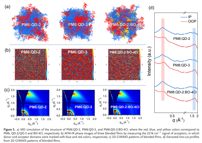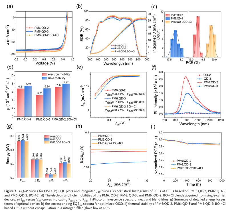 3. 结果表明,QD-2同时抑制了能量无序和电子-声子耦合,同时促进了有利的分子堆叠。这些特征产生了具有改进的激子和电荷动力学的纤维薄膜形态。因此,基于QD-2的OSCs在二元器件中实现了19.39%的PCE。