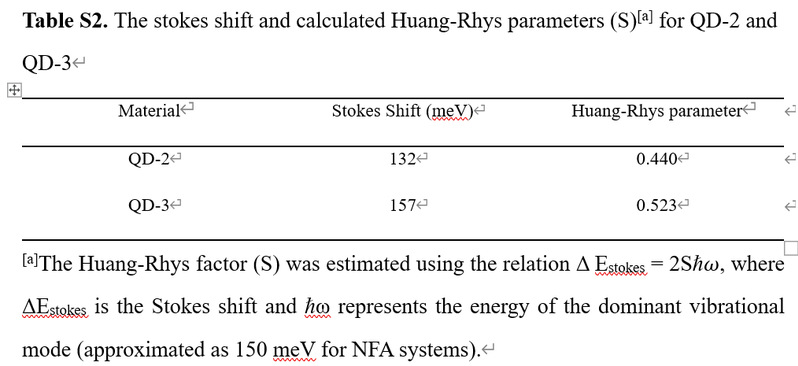 3.对Huang-Rys参数(S)的进一步分析证实,QD-2中的电子-声子耦合较弱,这与其较高的电子迁移率相一致。这种减少的耦合也抑制了非辐射损失,使QD-2的光致发光量子产率(PLQY)更高(QD-3为7.35%对5.71%)。