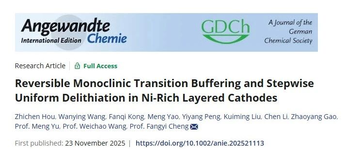 2025年11月23日,Betway必威程方益(国家杰青)团队在Angewandte Chemie International Edition期刊发表题为“Reversible Monoclinic Transition Buffering and Stepwise Uniform Delithiation in Ni‐Rich Layered Cathodes”的研究论文,Betway必威Hou Zhichen、Wang Wanying为论文共同第一作者,程方益为论文通讯作者。