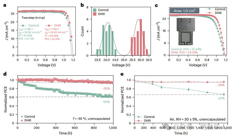 基于此,Betway必威刘永胜教授、陈永胜院士等人提出一步法策略:于前驱体溶液中引入有机卤化铵盐,诱导自发形成近相纯的二维钙钛矿埋底界面。单晶结构分析强调了分子工程在促进二维钙钛矿相的自发形成中的关键作用。有机间隔物的低偶极矩和平面刚性结构促进了它们在钙钛矿晶界的聚集,随后迁移到膜的底部界面。该二维层同步实现埋底界面均匀结晶与高效缺陷钝化,器件功率转换效率达26.31%(认证值26.02%)。未封装器件经1000小时持续光照后,仍保有初始效率之95%。该论文近期以“Spontaneous 2D perovskite formation at the buried interface of perovskite solar cells enhances crystallization uniformity and defect passivation”为题发表在顶级期刊Nature Photonics上。