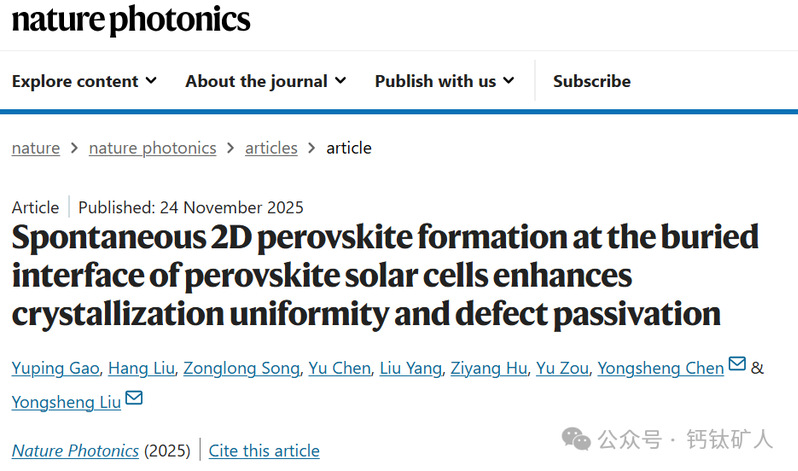 Gao, Y., Liu, H., Song, Z. et al. Spontaneous 2D perovskite formation at the buried interface of perovskite solar cells enhances crystallization uniformity and defect passivation. Nat. Photon. (2025). DOI:10.1038/s41566-025-01797-9
