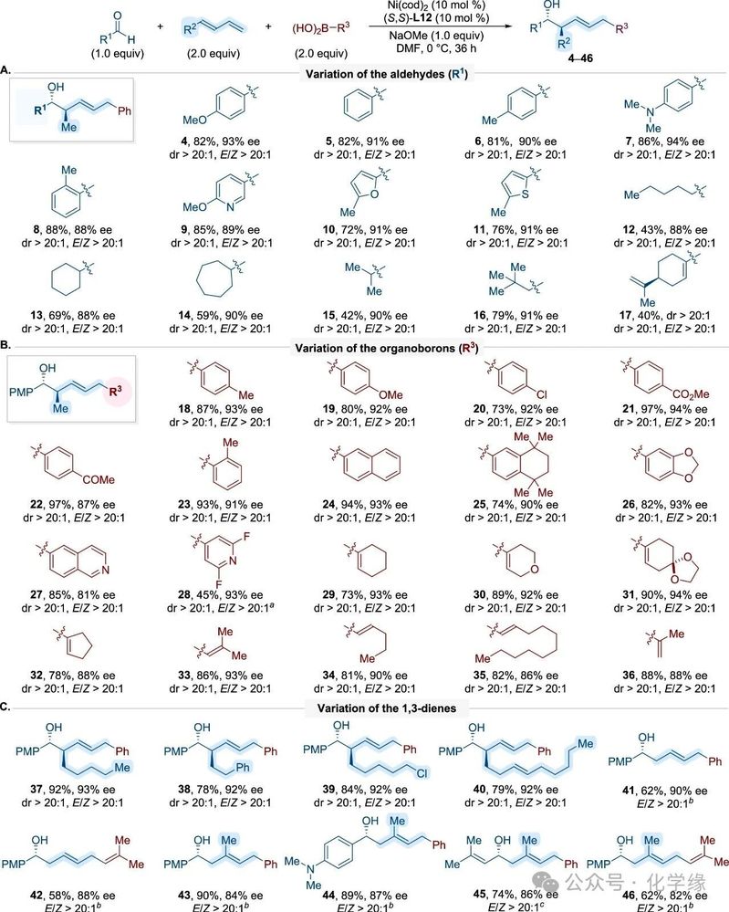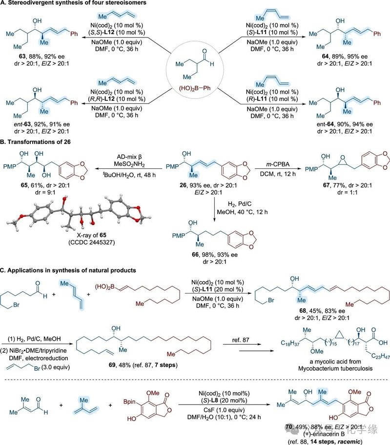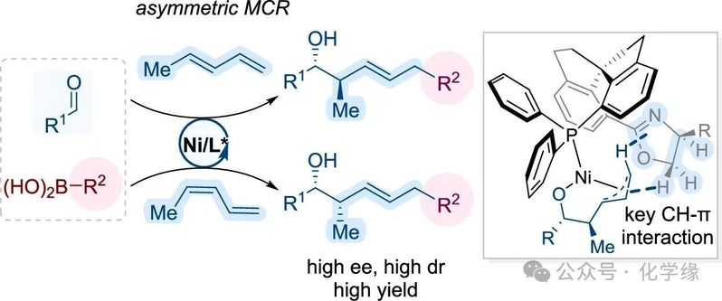 该方法实现了2-烯基-4-甲基-5-氧基结构单元的快速构建,具有出色的区域选择性、立体选择性和对映选择性。大量烷基取代的1,3-二烯均能以良好收率生成产物,且具有高顺反选择性和高对映选择性。