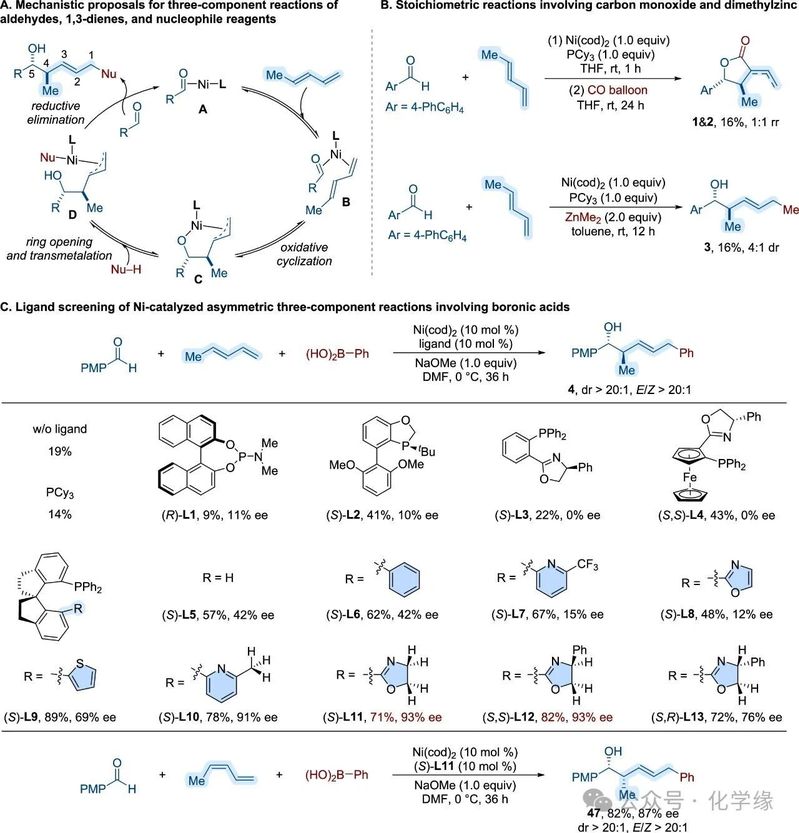 为应对单步构建复杂聚酮结构单元的挑战,提出开发一种以硼酸为亲核偶联试剂的不对称多组分反应。基于Ogoshi等人先前对异戊二烯与苯甲醛与镍(0)形成的烯丙基烷氧基镍(镍环)配合物的研究,构想出本体系的机理路径。该过程始于1,3-戊二烯与镍(0)中心配位(复合物A),形成中间体B,经氧化环化生成镍环C。该中间体作为后续开环反应与亲核试剂转金属化的平台,最终通过还原消除反应形成碳-碳键。作者利用镍(0)催化作用,从1,3-戊二烯和醛类化合物生成活性镍环中间体,从而实现目标2-烯基-4-甲基-5-氧基结构单元的高效一步组装。