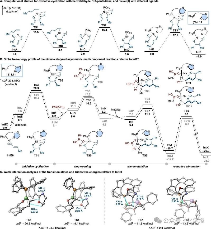 为探究相关反应机理,针对镍催化下苯甲醛与1,3-戊二烯经不同配体介导的氧化环化反应进行了DFT计算。分析重点聚焦于镍环的形成过程,该过程被确认为镍催化二烯-醛偶联反应的速率决定步骤。通过评估不同配体下的过渡态结构,计算结果显示:1,3-戊二烯作为配体时能量障碍为14.6 kcal/mol,PCy3配体为15.4 kcal/mol,而配体L11呈现显著降低的12.2 kcal/mol障碍值。