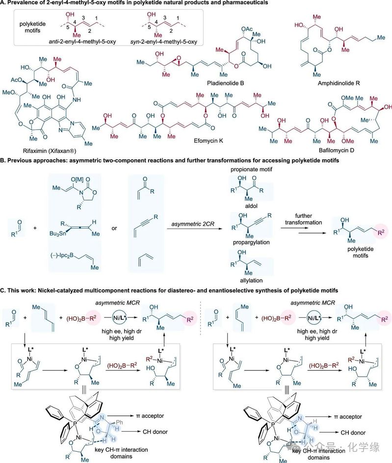 作者报道了一种催化性、立体选择性的多组分策略,可一步合成具有卓越收敛性、步骤经济性和立体控制的聚酮类相关骨架。该镍催化过程整合三种基础单元—醛、二烯及有机硼酸—实现高度官能化结构单元的快速组装。核心特征包括:(1)单步形成两个C-C键;(2)构建特定烯烃几何构型;(3)高外消旋选择性与对映选择性下同步生成两个相邻sp³立体中心;(4)通过手性螺环膦-噁唑烷配体实现广选性,可获得所有立体异构体;(5)机理证据揭示关键的CH-π配体-底物相互作用在立体控制中的作用。我们预期本文展示的核心理念—包括二烯连接体作为收敛连接器及配体驱动的CH-π立体控制—将广泛适用于天然产物合成与药物化学领域。