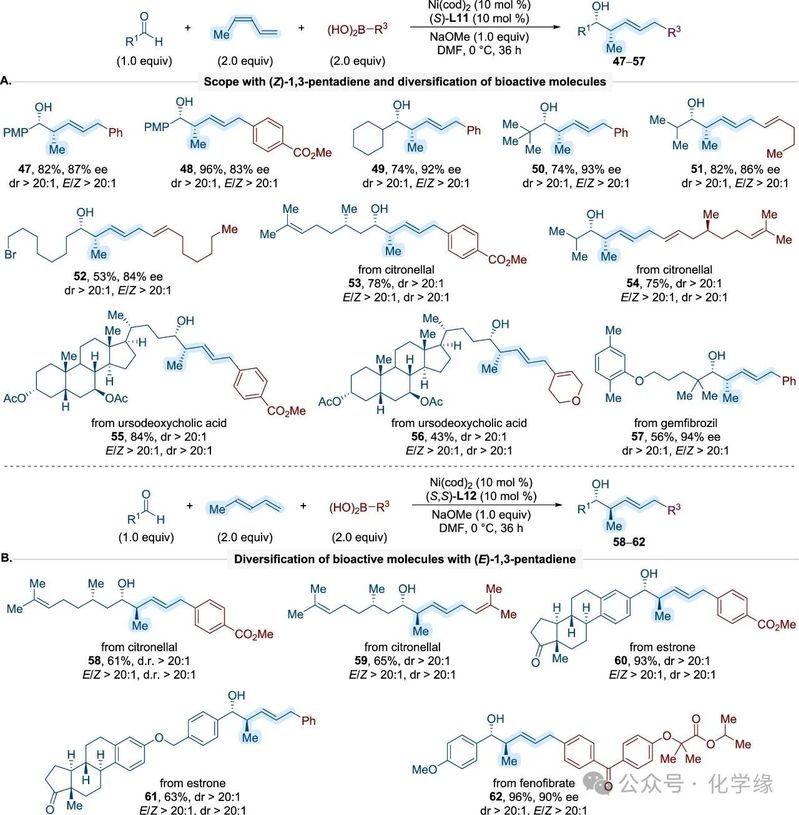 多种醛类(芳香族与脂肪族)以及各类芳基和烯基硼酸与(Z)-1,3-戊二烯的偶联反应均以高对映选择性生成反式构型产物。该方法在更复杂分子环境中的适用性,将其扩展至结构复杂且具有生物活性的底物。例如,使用对映纯香茅醛或由香茅醛衍生的烯丙基硼酸表明,醛基底物中额外存在的手性中心不会对多组分偶联反应的异构体选择性产生负面影响。此外,成功引入了多种含酮、酯、醚等功能多样化基团的天然产物和药物分子—包括estrone、ursodeoxycholic acid、fenofibrate和gemfibrozil。这些转化以良好至优异的收率和高对映选择性获得了产物。
